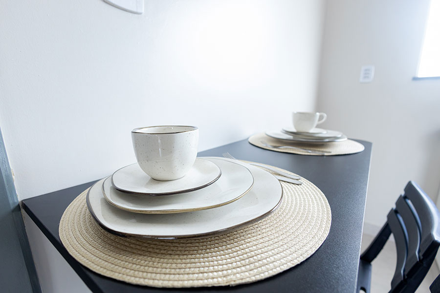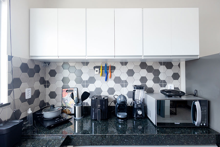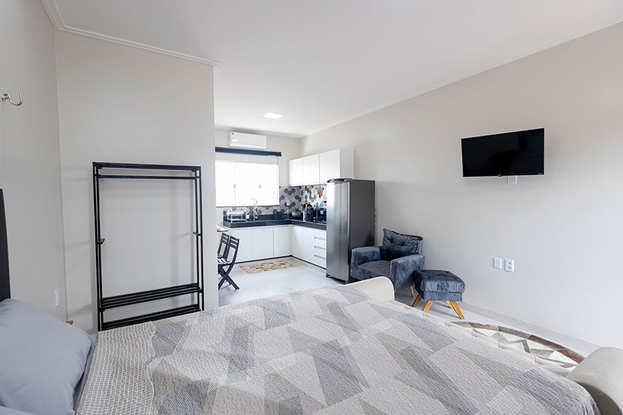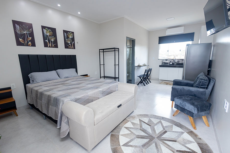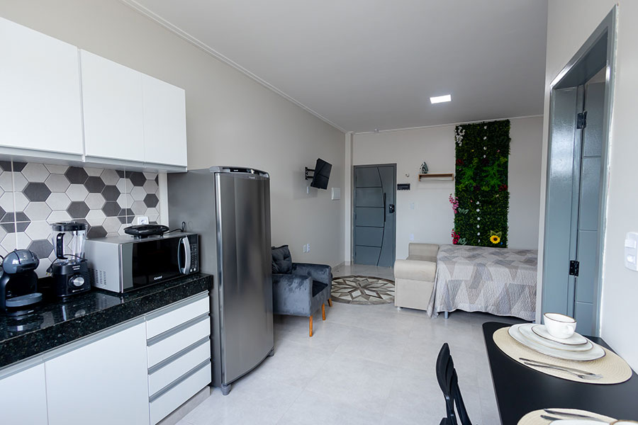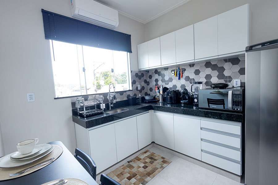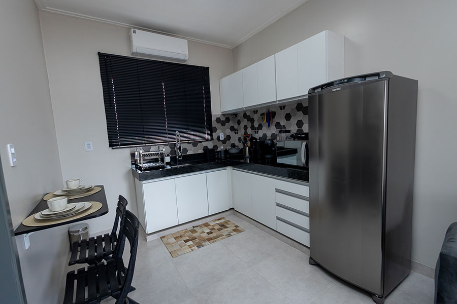 A cozinha é completa, com geladeira, fogão, micro-ondas, air fryer e todos os utensílios – panelas, copos, talheres e pratos – para que você possa preparar suas refeições com facilidade. Na área de jantar, uma mesa para quatro pessoas proporciona um ambiente agradável para suas refeições.